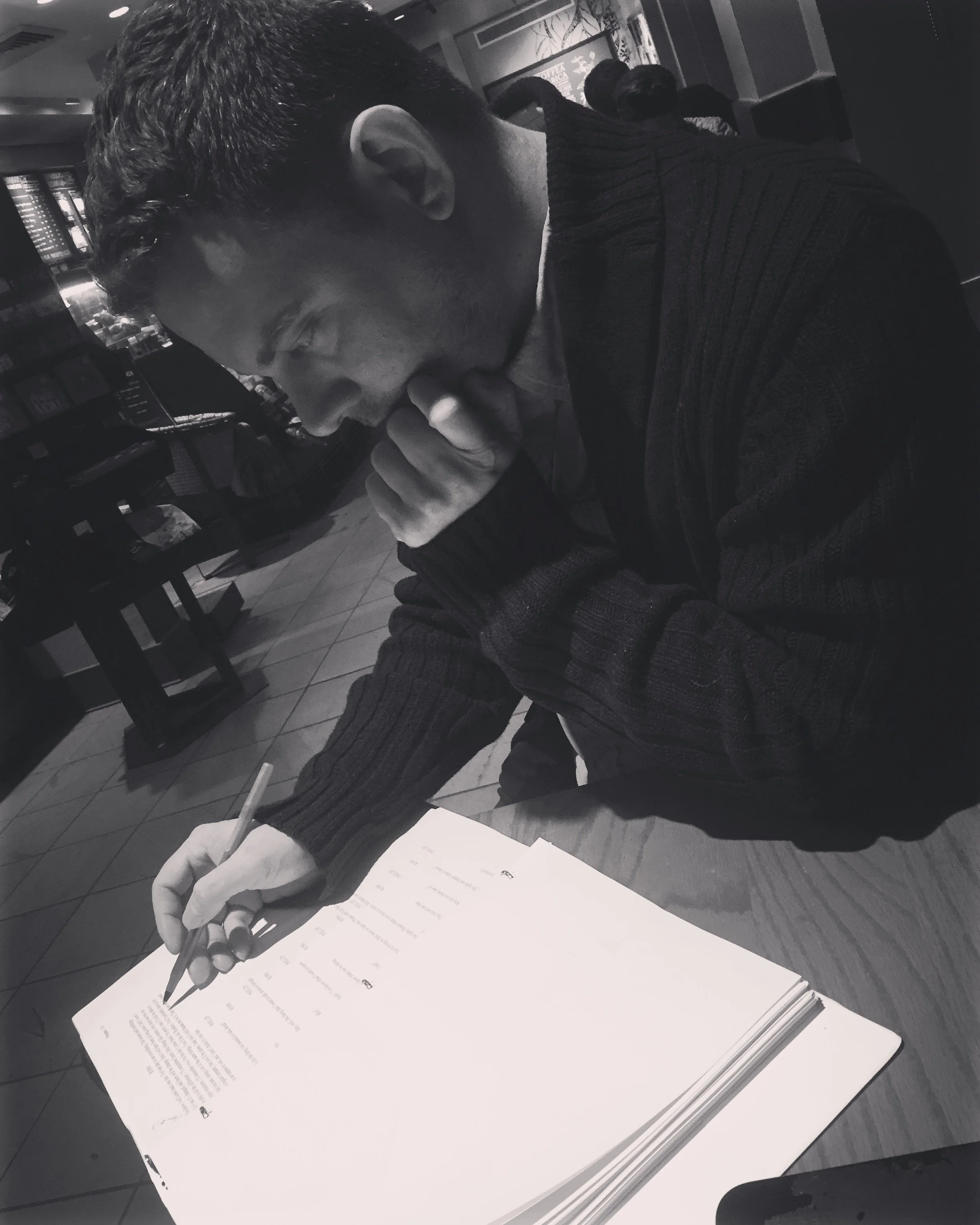 Erik Champney proofreads a new screenplay during a publicity shoot at New York’s Royalton Hotel. Photo by Dylan Goodwin.